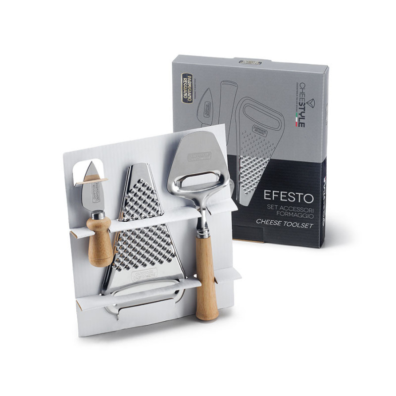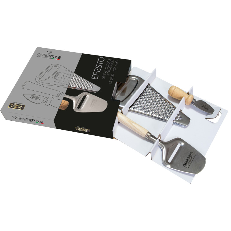 Kompletny pakiet umożliwiający najlepsze wykorzystanie Parmigiano Reggiano. Zawiera trzy sztuki. Dzięki tym akcesoriom możemy pokroić go w płatki, zetrzeć lub pokroić. Nożyk i "krajalnica" do sera wykonane są ze stali nierdzewnej z drewnianą rączką. Tarka jest w całości wykonana ze stali nierdzewnej.